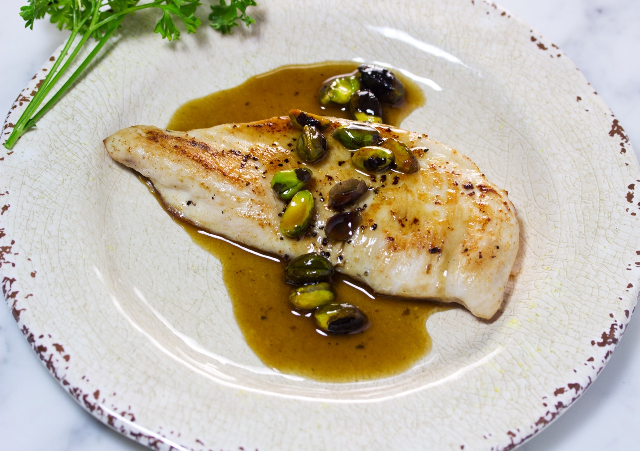 Pistachio maple pan sauce is a decadent sauce to drizzle over chicken or fish. Enjoy! If you have kids, they might be as excited as mine were when I told them the sauce was made with “pancake” syrup. My husband loved it too. The pistachios are only slightly crunchy after simmering in the sauce which adds a lovely texture…