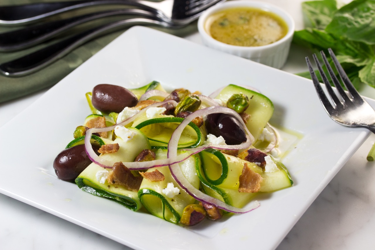 This healthy and delicious lemony marinated zucchini salad is the perfect side dish to bring to a summer cookout or on a picnic! The zucchini is topped with slivers of red onion, crumbled goat cheese, toasted pistachio nuts, Kalamata olives, and crispy bacon. So much tastiness in every bite!