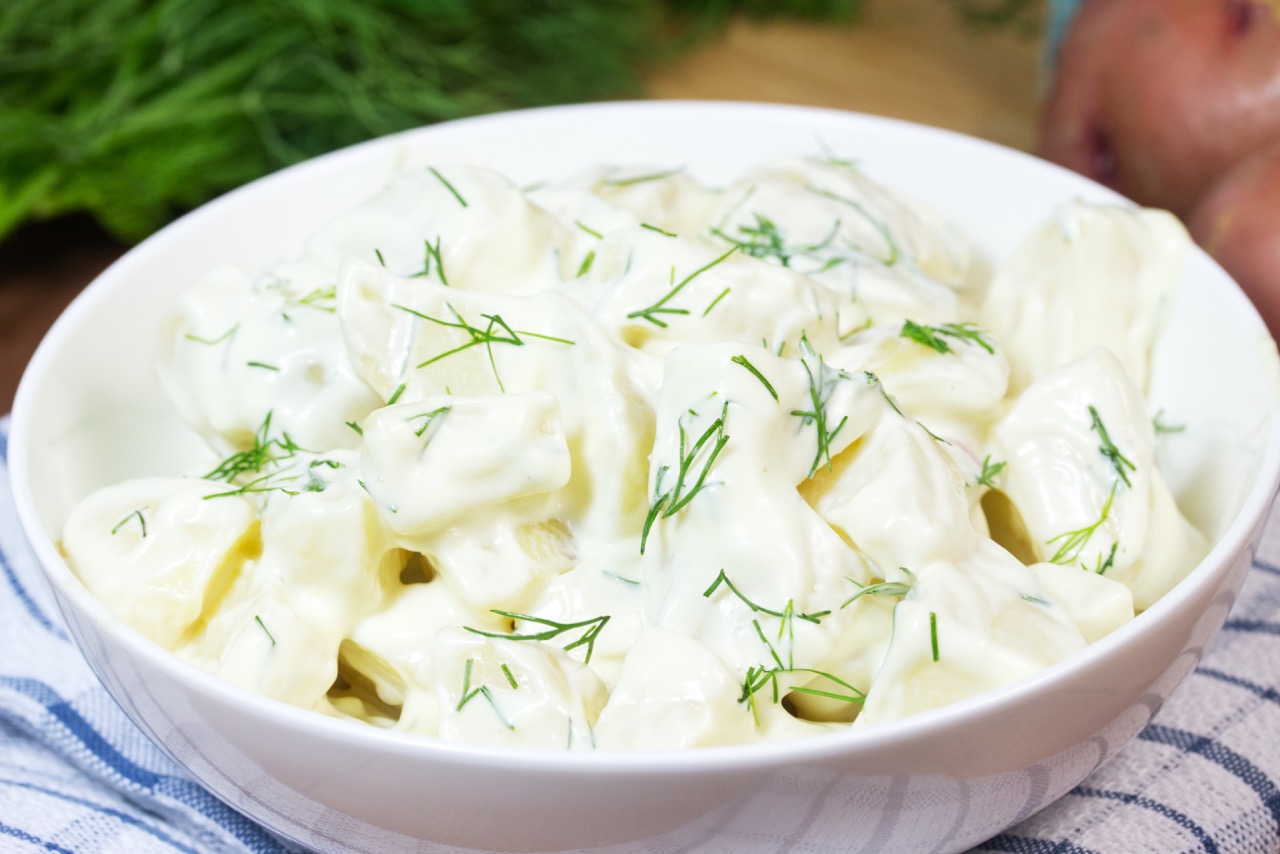 Potatoes are a real comfort food and what better way to enjoy them in the summertime but in a rich, creamy potato salad? There’s just something about a cool dish of potato salad that makes a summer meal a true delight. At the same time, though, I used to shy away from eating potato salad. I used to think something this tasty couldn’t be good for me. After all, it’s potatoes and mayonnaise. We all know what potatoes do to our waistline, right? And commercially prepared mayo is processed with all kinds of ingredients that we really don’t want to eat. Fear not!